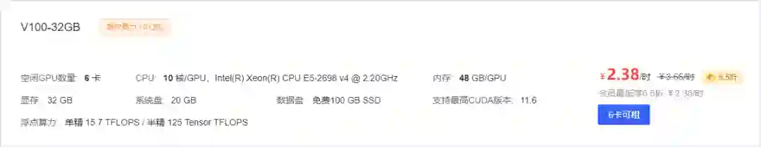 V100 作为上一代旗舰专业卡大家一定都很熟了,此为 NVLINK 版,租用多卡显存可线性拓展。