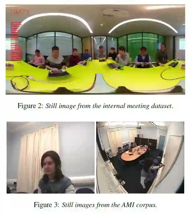本文所提出的方法在两个独立的数据集上进行了测试,一个是可公开获取的 AMI 会议数据集,另一个是论文作者组织采集的一个多模态会议数据集。图 3 展示的就是两个数据集中各自的一张静态图片。