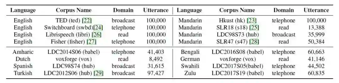 这篇论文的第一作者 Xinjian Li 目前在卡耐基梅隆大学语言技术研究所(LTI)攻读博士学位。这篇文章的主要面向的是低资源语音识别问题。使用多语言共享声学模型已有的研究方法就是先在一些语料上面进行预训练,然后再针对目标语言精调。但是这篇论文的作者认为以往的这种 pre-train+fine-tune 的思路忽视了训练集上各种语料独有的特点和语料之间的相似性。论文中所提出的方法主要是可以利用语料相关性的采样策略。将输入的语音特征和语料 embedding 联合起来作为整个模型的输入,输入具有 4 层双向 LSTM 的声学模型结构进行训练。在训练的不同阶段,使用不同的 temperature 来控制在不同语料上采样的概率分布。实验结果证明,这种采样策略训练得到的声学模型,在音素错误率(PER)上与其他的对比实验相比,有明显的性能提升,而且还得到了与语料相似性以及域相关性有关的有趣结果。需要注意的是,本文做到了声学模型这一步,没有后续的解码过程。