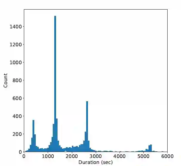 FAME! SD 语料是在之前的 FAME! 项目上边整理而来的。总共包含 6494 个数字录音带,总时长超过了 3000 小时。图 2 是 FAME! SD 语料中录音带时长分布。