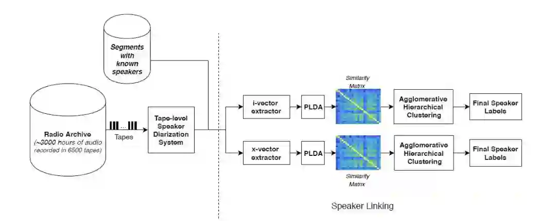这篇论文在方法上的创新主要体现在为在大规模数据上所提出的分阶段的说话人分割和识别方法。a). 第一阶段是通过基于贝叶斯信息准则(BIC)的语音分段,再加上通过基于混合高斯模型(GMM)的说话人聚类得到录音带级别的说话人分割。b). 第二阶段则是说话人连接和识别,具体就是将第一阶段得到的分割结果进行综合,其目标就是为出现在多个录音带中的说话人分配相同的标签。这一阶段是通过提取 i-vectors 和 x-vectors,并对计算得到的相似度矩阵进行聚类来完成的。论文实验部分基于分割错误率(DER)和说话人/聚类混杂度(speaker/cluster impurity)做了大量对比实验,证明了所提方法在大规模说话人分割任务中的有效性。