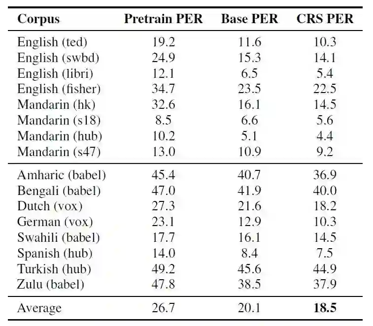图 4. pretrained 模型、fine-tune 模型和预料相关采样(CRS)训练得到的模型的音素错误率比较