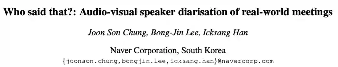本文作者署名单位是韩国的搜索引擎公司 Naver[1],但是其他检索结果还显示 J.S. Chung 本人就读(职)于牛津机器人研究所。J.S. Chung 是一位技术牛人,他的个人主页以及 googlescholar 上展示了多篇高水平研究论文的发表 [2]。这篇论文的主要工作是一个基于听觉-视觉多模态的说话人分割系统。论文使用语音活动监测(类似于静音检测)、说话人身份建模(声纹&人脸)、多模态关联等技术得到了具有较好鲁棒性的说话人分割系统。系统在全景视频、单声道以及多声道的音频作为输入的现实会议数据中得到了很好的定量和定性的结果,也在公开数据 AMI 中进行了实验,测试结果超越了所有的对比方法。论文作者还提到,当数据是多声道音频的时候,波束成形方法和视频结合起来可以进一步提升性能。