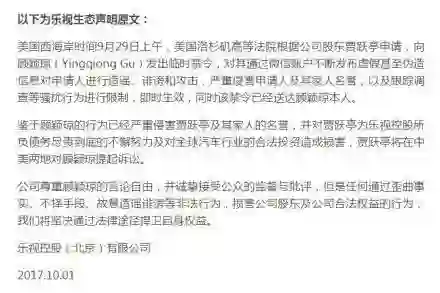 10月1日上午消息,针对此前顾颖琼发文称贾跃亭设立不可撤销的信托基金,乐视控股通过回应称,美国洛杉矶高等法院根据公司股东贾跃亭申请,向顾颖琼发出临时禁令,对其发布虚假甚至伪造信息对申请人进行造谣、诽谤和攻击,严重侵害申请人及其家人名誉,以及跟踪调查等骚扰行为进行限制,即时生效。