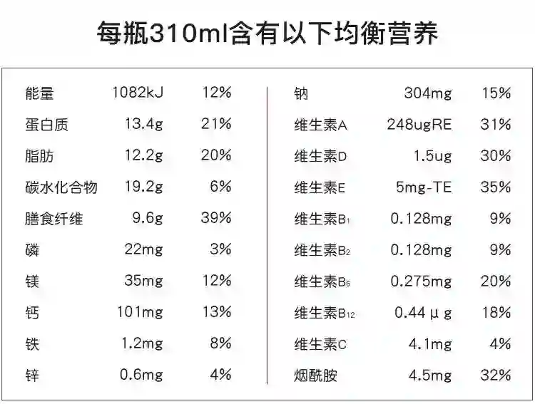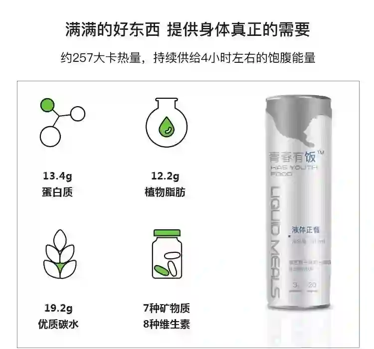 青春有饭液体正餐,每一瓶310ml,可提供蛋白质13.4克、脂肪12.2克、碳水化合物19.2克、膳食纤维9.6克,主要来自燕麦粉、牛奶蛋白、大豆蛋白、椰子油和麦芽糊精。除了这些每餐必需的营养成分之外还有足量的维生素A、维生素B、维生素C、维生素D、维生素E以及钙、镁、锌、铁等矿物质,充分满足了对日常饮食的营养要求。