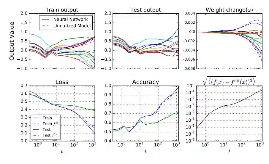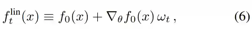在实验部分,本论文展示了线性化网络(linearized network)能获得和原始深度非线性网络相同的输出结果和准确率等。这一部分简单介绍了什么是线性化的网络,更多理论分析可以查看原论文的第二章节。对于线性化网络的训练动态过程,首先我们需要将神经网络的输出替换为一阶泰勒展开式: