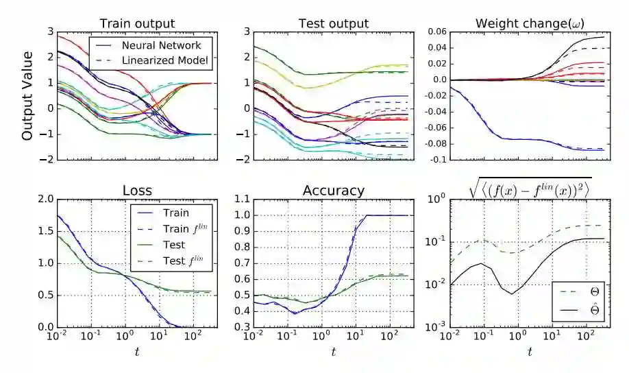 因此,尽管没有训练该网络,我们同样能获得线性化神经网络沿时间的演化过程。我们只需要计算正切核函数 Θ_0 hat 和初始状态的输出 f_0,并根据方程 11、12 和 9 计算模型输出和权重的动态变化过程。重要的是,这样计算出来的值竟然和对应非线性深度网络迭代学习出来的值非常相似。
