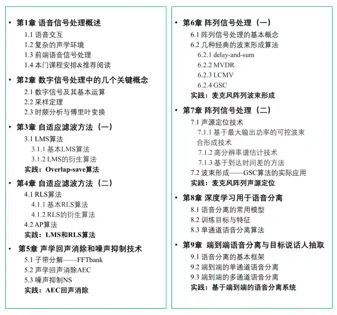 学习内容包括语音交互、噪声一致、自适应滤波方法、语音前端处理(包括但不限于语音增强、回声抵消、麦克风阵列信号处理等)、端到端的语音分离等。