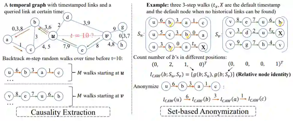 时序网络是现实世界中动态系统的抽象。这些网络通常根据某些定律发展,例如社交网络中很普遍的三元闭包定律。归纳表示学习时间网络应该能够捕获此类定律,并进一步将遵循相同定律应用于未在训练过程中见过的数据,即inductive的能力。以前的工作主要依赖于网络节点身份或丰富边属性,通常无法提取这些定律。因此,本文提出了因果关系匿名游走(Causal Anonymous Walks, CAW)来inductively的进行时序网络的表示学习。