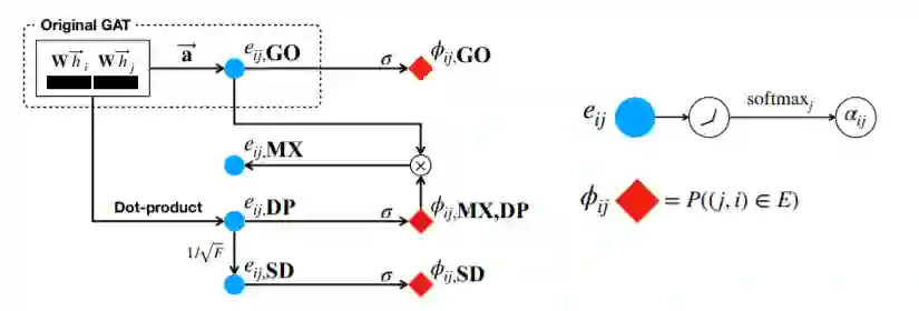 原始GAT与SuperGAT对比:原始的GAT如矩形图中所示。SuperGAT通过一对节点中是否存在边来引导注意力。用
