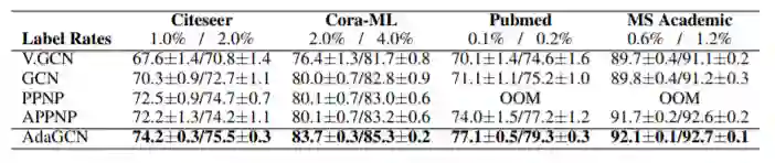 表格中显示了不同模型的精度对比。可以看到AdaGCN比其他模型表现更好。