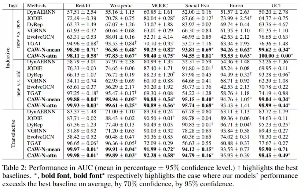 具体来说,CAW是通过时间随机游走提取类似motif的结构来捕获图的动态性,这避免了motif计算复杂的问题。同时,CAW采用新颖的匿名化策略,用一组节点的命中计数来替换节点身份以保持模型inductive的能力,同时也建立了motif之间的相关性,这对于某些图挖掘任务(如链路预测)是非常关键的。进一步的,本文进一步提出了一个神经网络模型CAW-N来编码CAW。最后,在6个真实时序网络数据集上,CAW-N均取得了大幅度的提升,例如AUC提升了15%!
