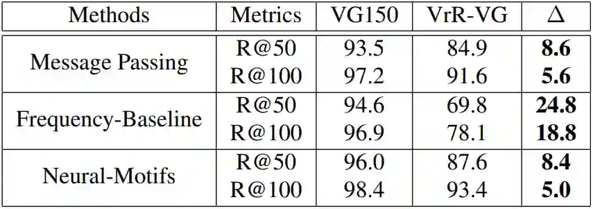 Freqency-Baseline是非学习型方法,基于对数据的统计。在我们的实验中,VrR-VG明显的拉开了非学习方法与可学习方法之间的性能差距。更加凸显出场景图生成任务中,各个方法的真实性能。同时,实验也说明非视觉相关的关系比较容易。相对来说,在含有大量非视觉关系的情况下,网络学习到的内容和基于统计的非学习型方法直接推断的内容差距有限。
