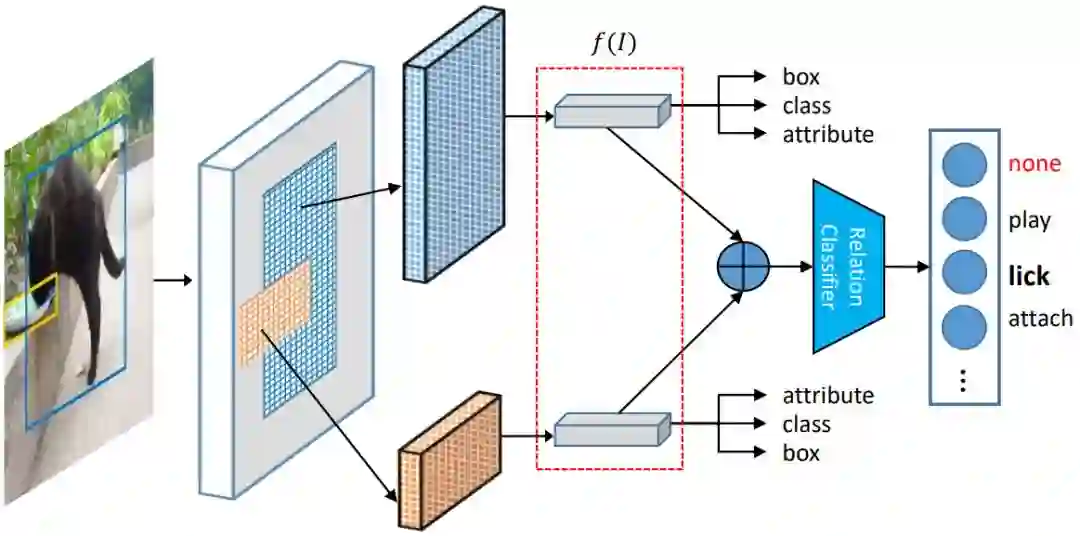 其中,我们使用Faster-RCNN用于特征提取,f(I)取自于RPN部分。网络综合的学习位置、类别、属性和关系信息。通过对象关系的信息,进一步拓展特征的语义表征能力。