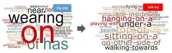 但现有关系数据中,由于大量先验偏置信息的存在,导致关系数据的特征并不能有效的利用在语义理解中。其中,位置关系如"on", "at"等将关系的推理退化为对象检测任务,而单一固定的关系,如"wear","has"等,由于数据中主体客体组合搭配固定,此类关系将关系推理退化为简单演绎推理。因此这些关系数据的大量存在,导致关系特征的学习更多倾向于对单物体感知,而非真正的对场景语义的理解,从而无法使关系数据发挥的作用。同时,这种语义上的、学习上的先验偏置,无法通过常规的基于频率或规则的方法筛选剔除,这导致上述数据端的问题阻碍了关系语义理解上的发展与研究,使得视觉对象关系的研究与语义理解的目标渐行渐远。