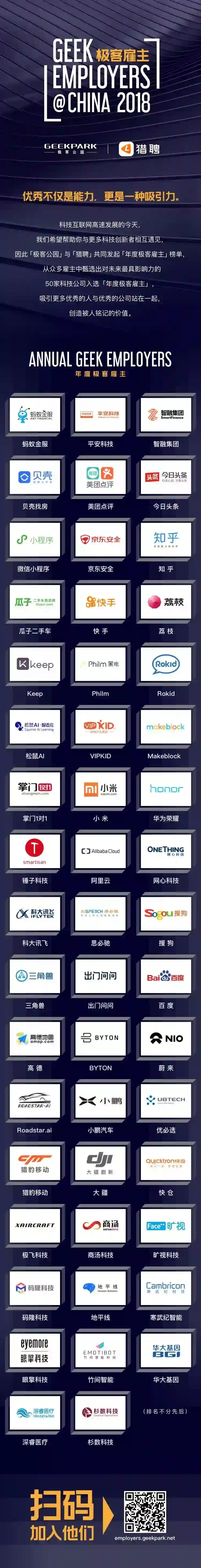 因为只有如此,具备同样开拓力、创造力、改变力,和认知力的人才才会因此而聚拢汇聚;而极客公园和猎聘通过甄选并发布汇聚了这样 50 家优秀公司的「极客雇主 2018」榜单,我们希望,优秀的人与优秀公司的真正高效汇聚将从此开始。