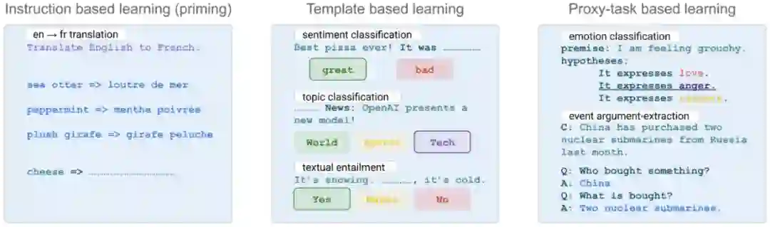 第一类是最简单的方式:基于任务指令(instruction)的方法。这种方法最早出现于 GPT-3 和 T5 的论文中。使用这种方法的时候, 一般会使用能进行文本生成的语言模型(例如 GPT-3,T5):输入会提供任务的描述和一些例子,接着提供一个想要让 PLM 来处理的输入文本,让 GPT-3/T5 来生成答案。这种方法也被称为语境学习(In-context learning)或 priming。这种方式往往需要一个非常大的,类似于 GPT-3 的模型,才能有不错的性能。因为 PLM 模型并不一定能理解任务描述或者通过例子来「理解」任务需求, 所以最近一些来自 Google 和 AI2 的工作(详情参见论文 3.1)利用一些 NLP 任务的任务描述来微调 PLM,这样 PLM 在看到全新的任务描述时会有更好的效果。