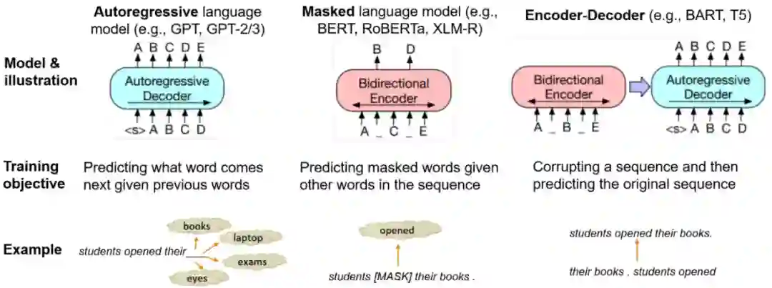 图1:三种常见的 Pre-Trained Language model:模型示意图、训练目标和示例。