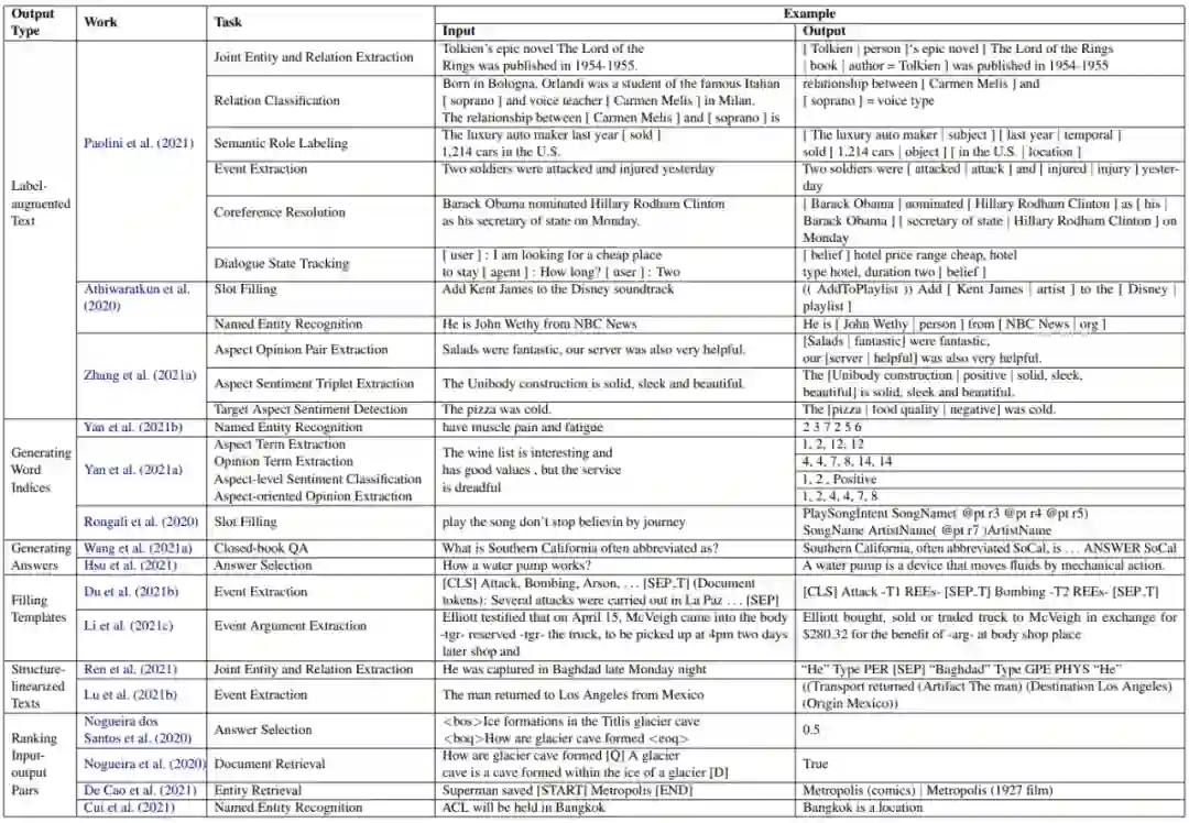 图 4 总结了几种常见的把 NLP 任务转换成文本生成任务的方法和它们的应用实例。其中把这些方法按照输出类型来分类: