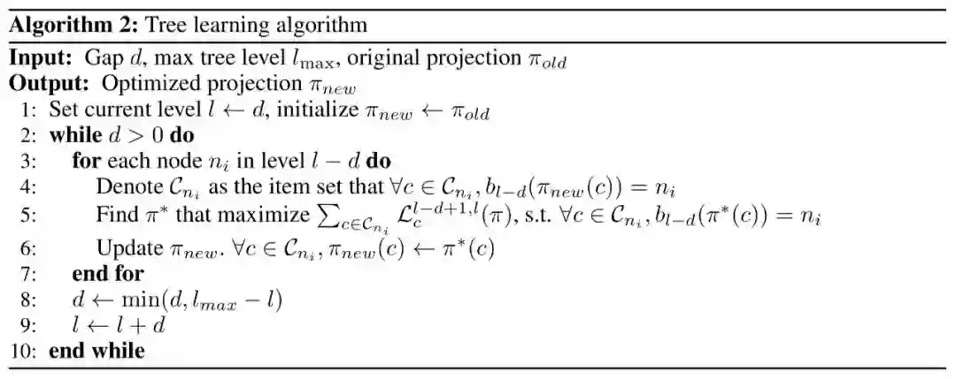 JTM 给出了一种统一目标下联合优化深度树匹配模型的打分模型和树索引结构的算法框架。在树结构优化中,我们基于树型结构的特点提出了一种可用于大规模任务的分层重建算法。在模型优化和打分中,基于树上检索逐层细化候选集合的本质,我们相应的提出了对用户行为特征层次化的建模方法。