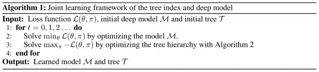 在求解中,由于优化 π 是一个组合优化问题,很难和 θ 用基于梯度的优化算法同时优化。因此,我们提出交替优化 θ 和 π 的联合优化框架,如下图所示。优化 θ 和 π 的目标一致性促进了整个算法的收敛。事实上,如果模型学习和树学习能够同时使得损失函数下降,那么整个算法一定会收敛,因为 {L(θt,πt)} 是下界为0的单调下降序列。