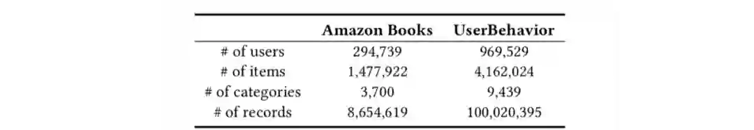 我们使用了 Amazon Books 和 UserBehavior 两个大型公开数据集来进行方法的效果评估。Amazon Books 是用户在 Amazon 上的行为记录,我们选择了其中最大的 Books 这一子类目。UserBehavior 为阿里开源的淘宝用户行为数据集。数据集的规模如下: