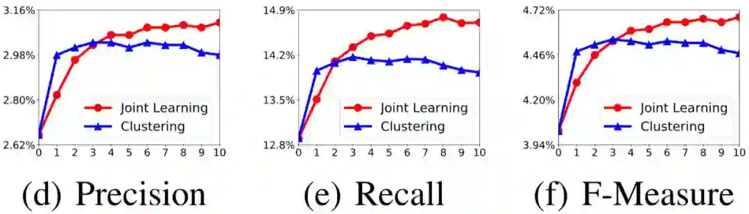 从实验结果中可以发现,本文提出的 JTM 方案,在树结构学习的逐步迭代过程中,能够稳定地收敛到一个更优的树结构。与之对比的是,基于聚类的方案,在迭代最后都会出现类似于过拟合的情况。