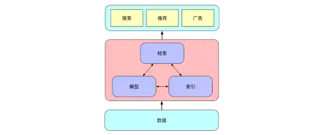 如下图所示,在大规模任务中,搜索,推荐和广告的系统通常由模型,索引和检索算法三大组件组成。模型计算单个用户-商品的偏好概率,索引将所有商品有序地组织在一起,检索算法根据模型的输出在索引中召回最终的推荐结果。三者共同决定了召回质量且存在内在联系。