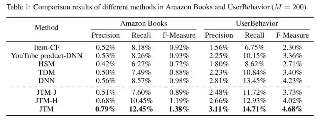 JTM: 本文中提出的联合优化方法。同时,我们对比了 JTM 的两个变种版本,分别为 JTM-J 和 JTM-H。其中,JTM-J 为使用了树结构联合优化但没有采用层次化用户兴趣表达的版本;JTM-H 相反,其使用了层次化用户兴趣表达,但会使用固定的初始树结构而不进行联合学习。