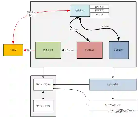 ● 处理模块1:负责和手机交互,UI自动化操作,管理,结果记录和存储等;