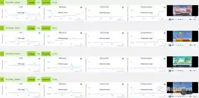 如下图所示,每一行对应天天酷跑一局游戏,分别展示了手机CPU利用率,内存使用量,电池电量,温度,玩一局跑的里程数和游戏时间以及死亡前的游戏画面。