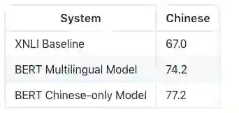 前两行是XNLI baseline的结果,后三行是使用BERT的结果。