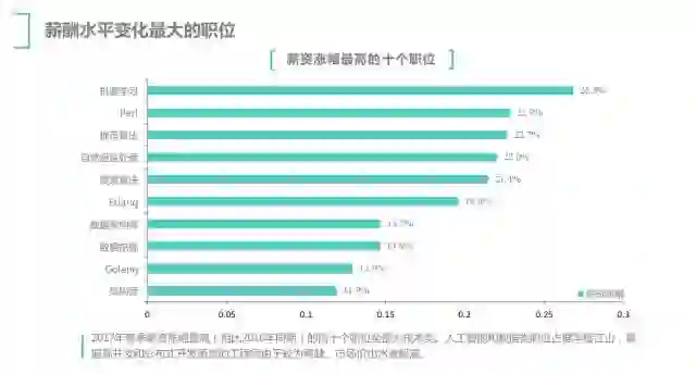 而据另一家互联网招聘机构 BOSS 直聘发布的《2017 春季互联网人才趋势报告》显示,近一年来薪资涨幅最高的十大职位中,人工智能和数据类职位已经占据了半壁江山。