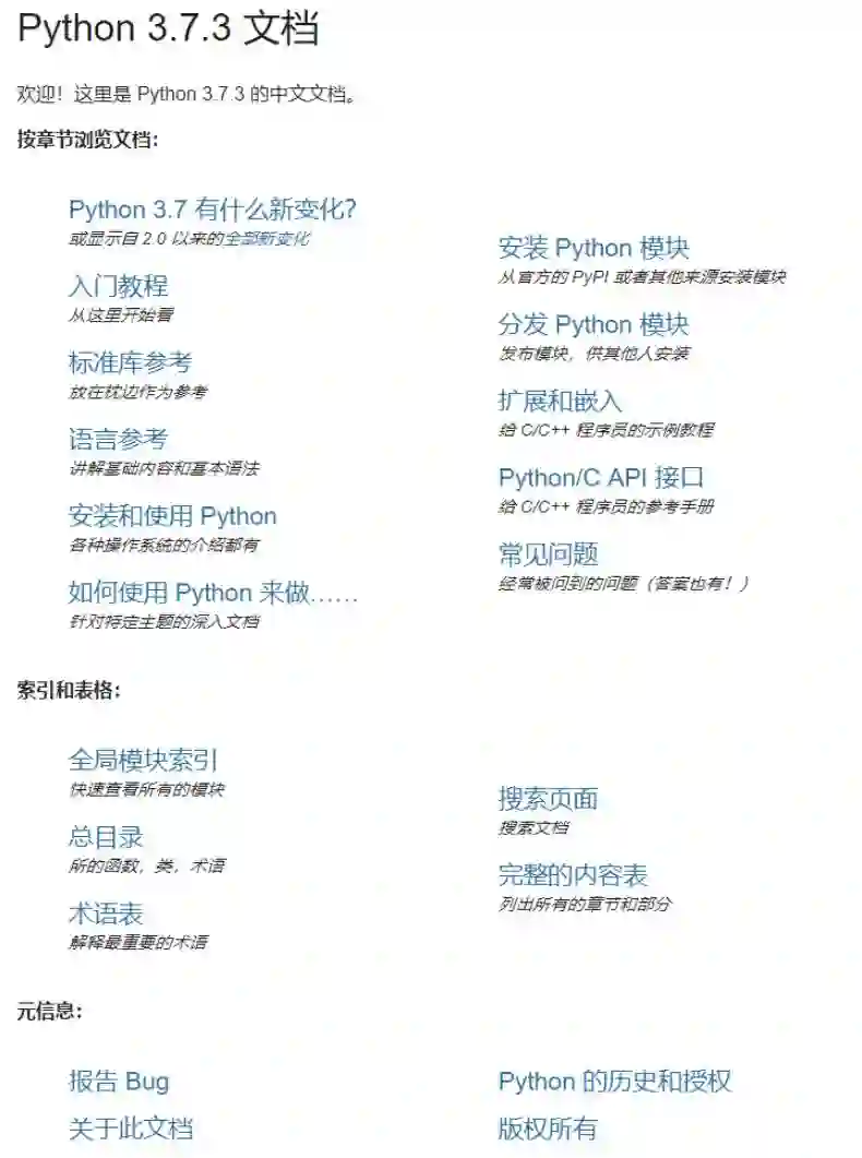 目前,官方中文文档已经有 3.8.0a2、3.7.3、3.6.8、2.7.16 几个主流版本的资料,相比英文文档只缺少 3.5.7。对于每一个 Python 版本,文档都包含很多内容,其中入门教程与语言参考已经完成汉化,其它基础内容也都有中文译文,例如各版本的新变化、安装和分发 Python 模块、常见问题等等。