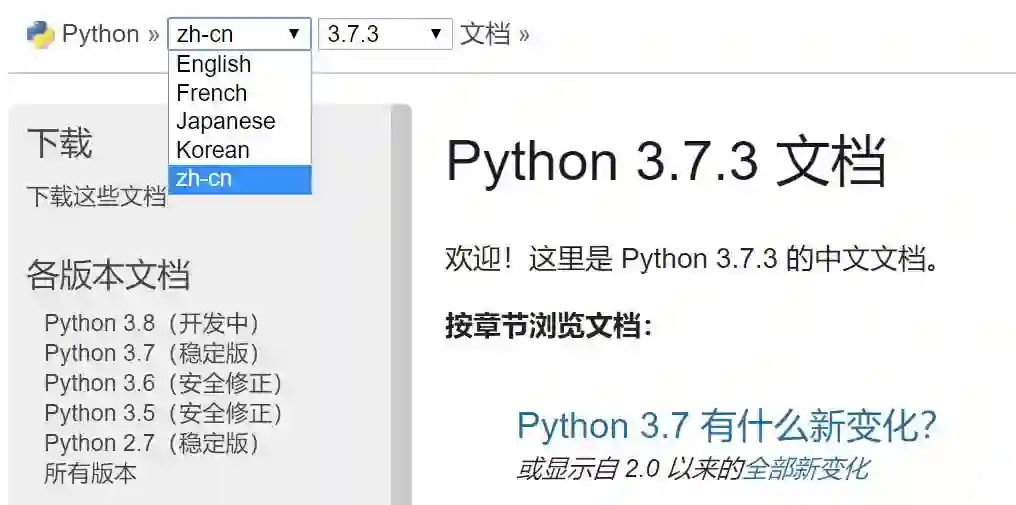 但是如果我们在地址栏中手动键入 zh-cn,即:https://docs.python.org/zh-cn,那么我们就能看到官方的中文文档了。如下,我们现在从下拉项也可以直接看到中文选项。因为 Python/C API 接口等高阶内容还是英文,所以很可能目前中文文档还在完善中,并没有完全开放。