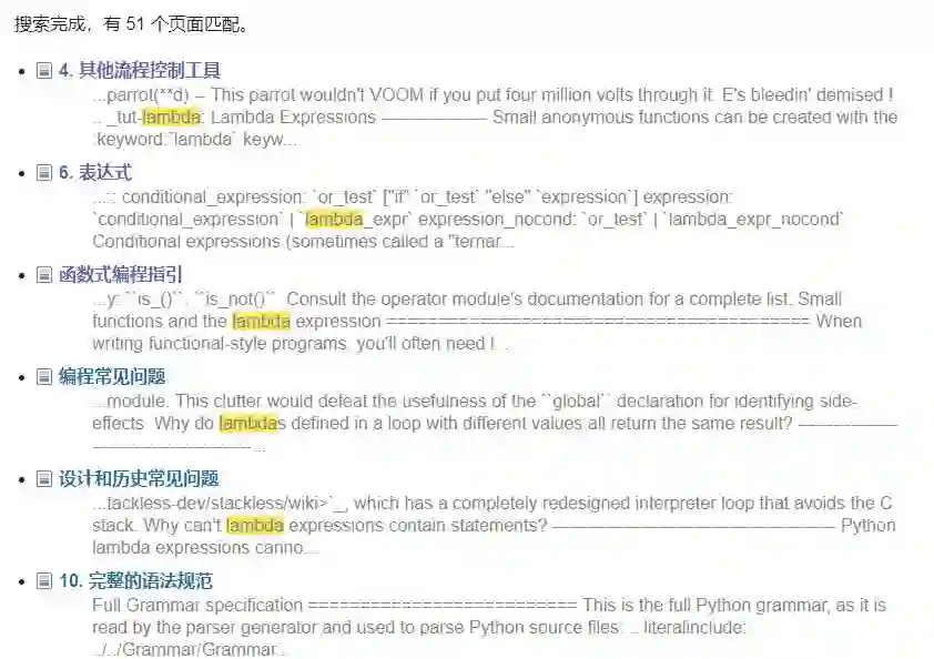 可能对大多数开发者而言,检索 Python 的函数或用法是文档的常用方法。例如如果我们希望找到函数式编程的使用方法,那么可以在中文文档中搜索 Lambda: