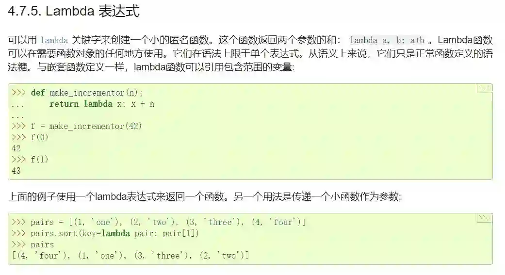 其中流程控制工具有匿名函数 Lambda 的使用简介,而重要的函数式编程指引暂时只有一小部分完成翻译。如下展示的是检索到的 Lambda 使用指南。
