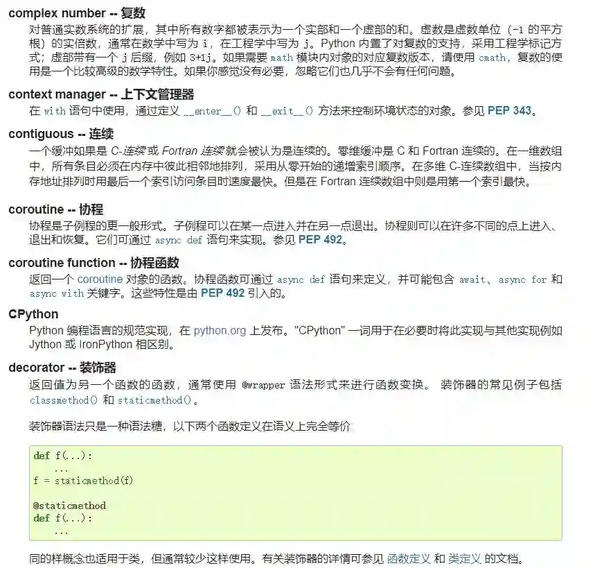 最后,Python 中文文档还有个小彩蛋,它把 Python 中的术语都翻了一遍。很多时候,这些术语都有不同的译文与表达方式,例如 decorator 既可以保留原文,也可以翻成装饰器或修饰器。也许以后,这一份官方词汇表可以帮助我们找到更合适的表达方式。