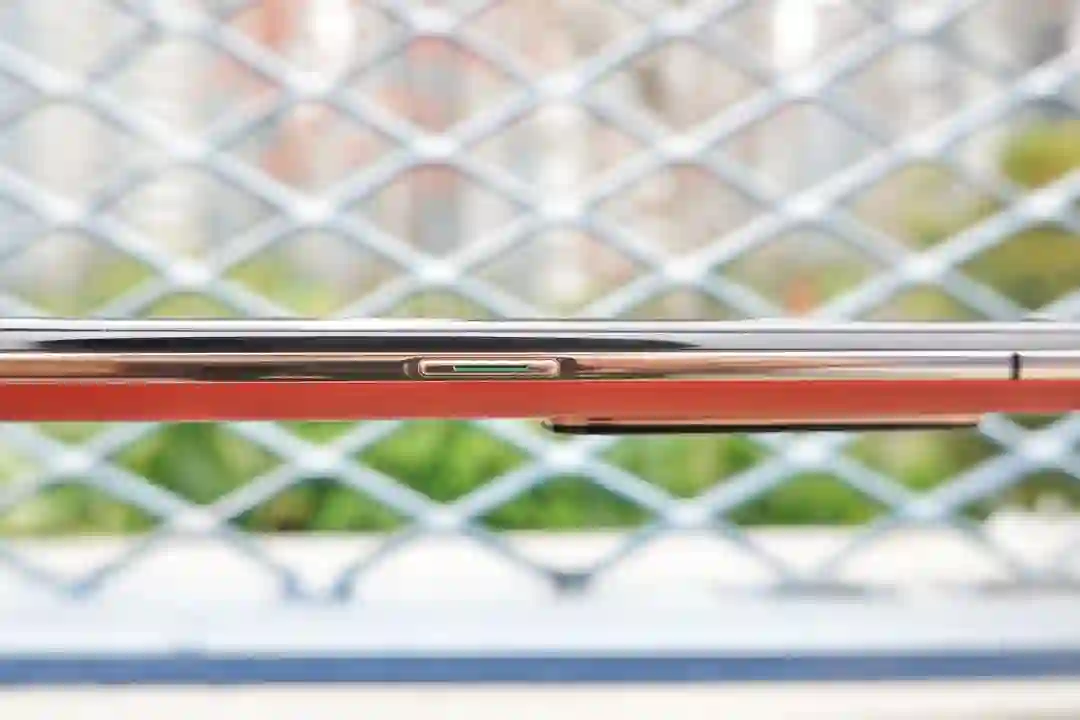 第二,Find X2 Pro 给边框上的三个按键都做了弧度处理,按键的边缘也留出了一定区域,这样即使两边的边框很窄,也能够不看手机准确的触摸到这三颗按键,并且在电源键上还额外加了一条象征电量的淡绿色线条。