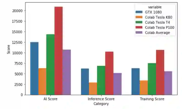 Jeremy DiBattista 就如何对其进行测试进行了说明。和 eGPU 一样,他使用 AI Benchmark 进行测试。这是一个非常简单但功能强大的 Python 库,利用 Tensorflow 框架在 19 个不同的部分上进行了 42 个测试,从而为 GPU 提供了出色的通用 AI 评分。接下来,Jeremy DiBattista 进行了 15 次的初始化,每次使用 AI Benchmark 进行测试,记录结果以及分配 GPU —得到了 K80 十次,P100 四次,T4 一次,Jeremy DiBattista 表示从来没有得到 P4,但是应该比 T4 稍差一点,速度对比图如下图: