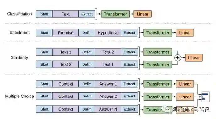 上图是对不同任务进行微调的输入转换。将所有的结构化输入转换为 Token 序列,然后使用预训练模型(Transformer)进行处理,最后使用线性和 Softmax 层完成特定的监督学习任务。