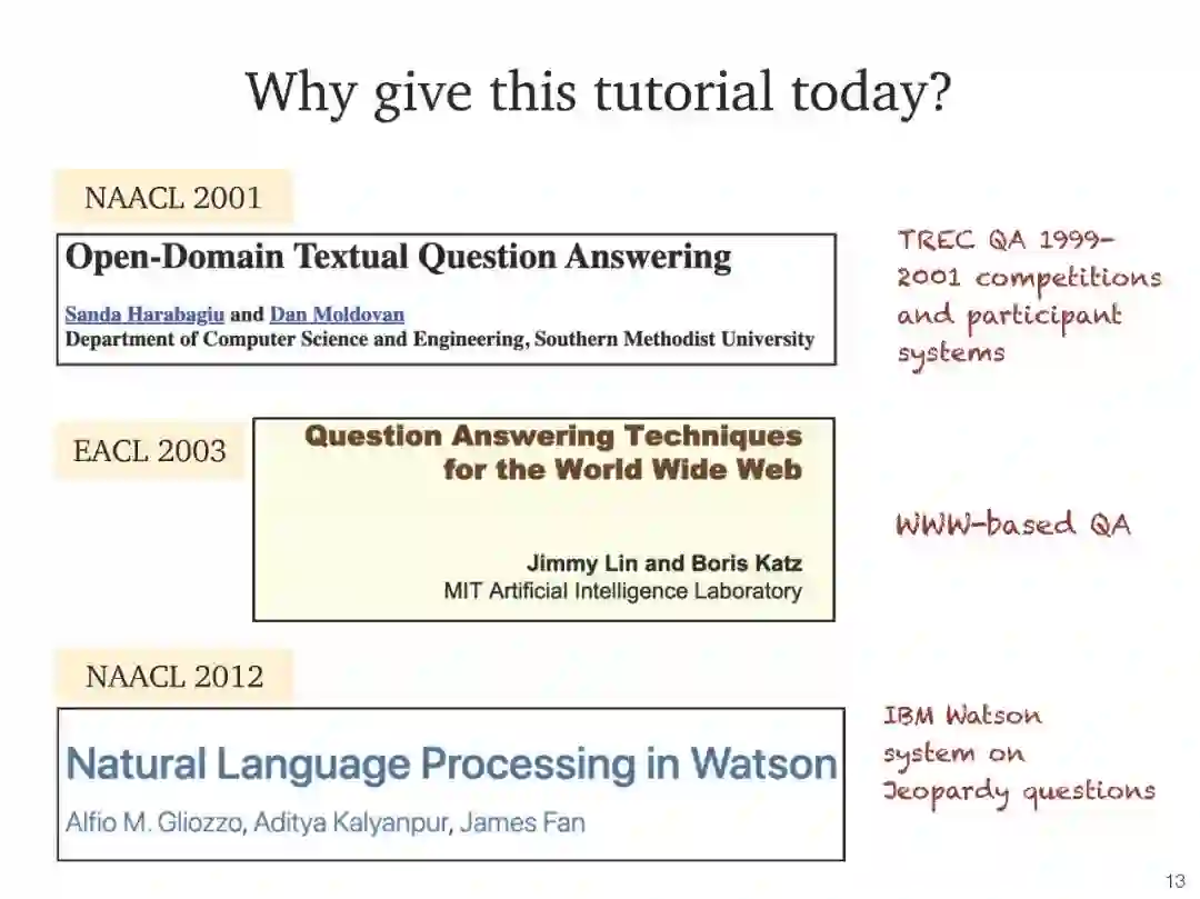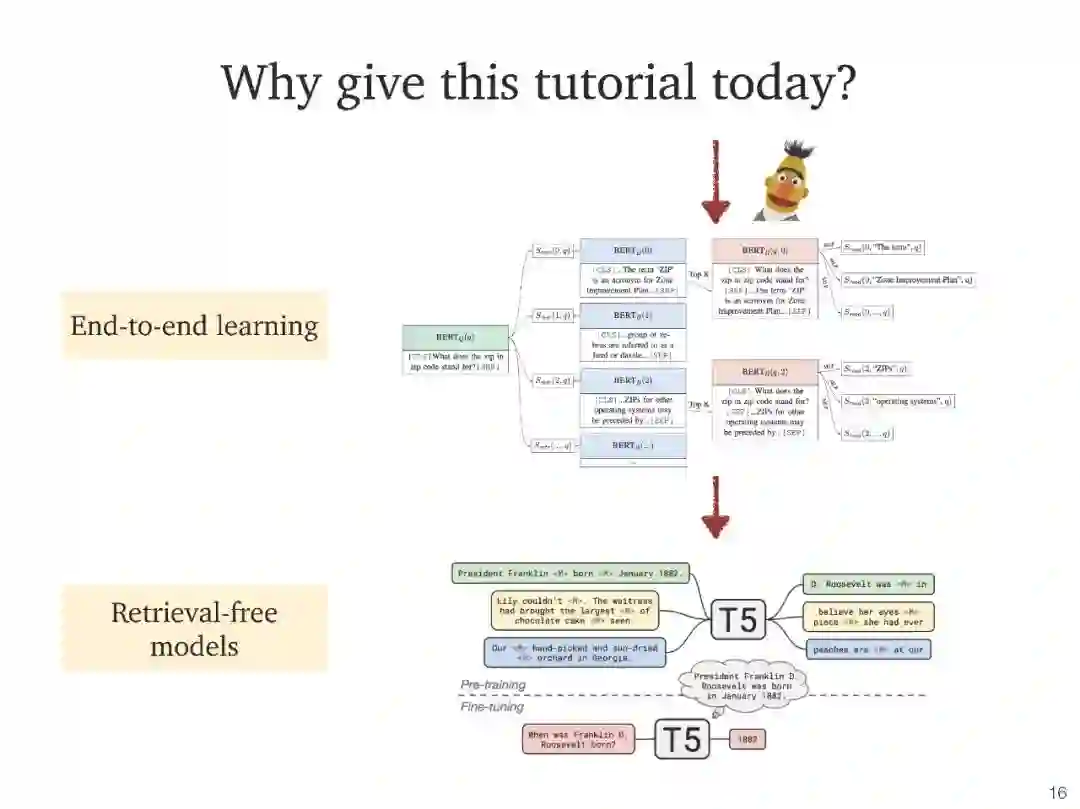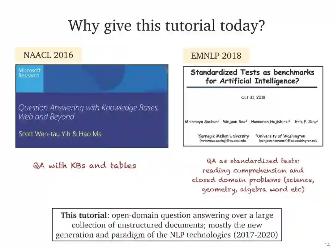 本教程提供了关于开放域问答(QA)方面前沿研究的全面概述,QA的任务是使用大量不同主题的文档集合回答问题。我们将首先给出一个简要的历史背景,讨论研究问题的基本设置和核心技术挑战,然后描述具有共同评价指标和基准的现代数据集。然后,重点将转向为开放领域QA提出的最新模型,包括两阶段检索-读者方法、密集检索和端到端训练,以及无检索方法。最后,我们将介绍一些使用文本和大型知识库的混合方法,并以一些重要的开放问题结束本教程。我们希望本教程不仅能帮助读者获得最新的知识,还能提供新的视角,以促进下一阶段开放领域QA研究的进展。