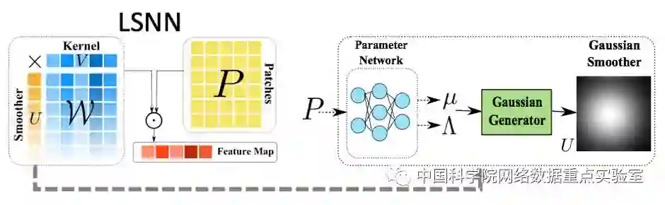 局部平滑神经网络和局部连接神经网络一样,在不同的局部区域,会有不同的参数,但是对于局部平滑神经网络而言,相邻的局部区域间的参数被一个空间分布所约束。我们将所有的参数看做W,那么在卷积神经网络中所有局部区域的W是相同的,在局部连接神经网络中所有局部参数是独立的,而在局部平滑神经网络中W是由一个空间分布函数U和一个共享的局部算子V共同决定的。