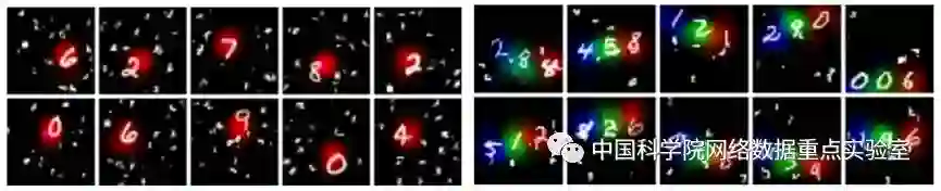 在我们设计的升级版MNIST数字识别的实验中,通过利用高斯分布作为U,可以在实验中学习到数字分类的同时,定位数字在图片中的位置。下图展示了我们的部分实验结果。