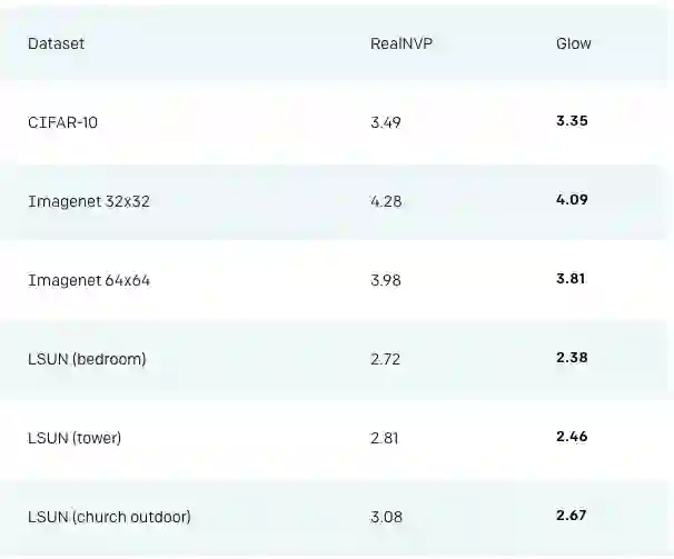 利用这种技术,我们在标准上比较了RealNVP和我们的Glow,RealNVP是在这之前表现最佳的流式生成模型。结果如下: