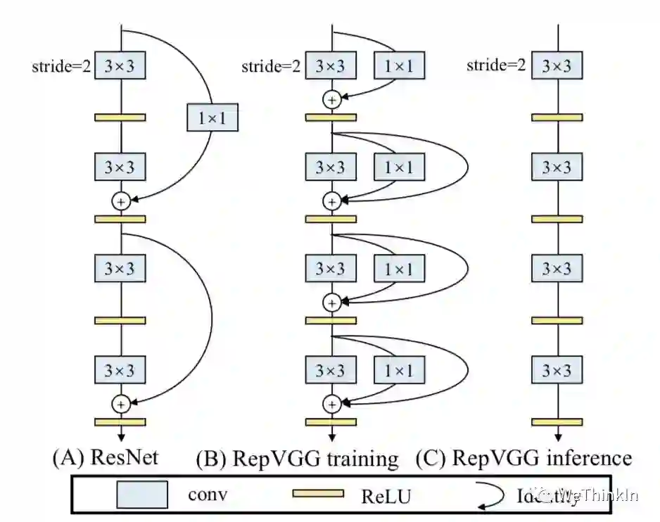 RepVGG模型的基本架构由20多层 卷积组成,分成5个stage,每个stage的第一层是stride=2的降采样,每个卷积层用ReLU作为激活函数。