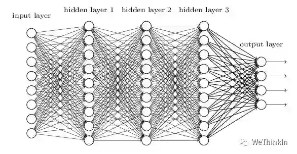 例如下面所示的含有三个隐藏层的神经网络,梯度消失问题发生时,接近输出层的hiden layer3的权重更新比较正常,但是前面的hidden layer1的权重更新会变得很慢,导致前面的权重几乎不变,仍然接近初始化的权重,这相当于hidden layer1没有学到任何东西,此时深层网络只有后面的几层网络在学习,而且网络在实际上也等价变成了浅层网络。