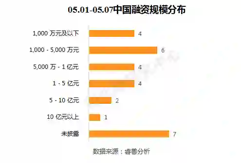 本周融资事件的融资规模在1,000-5000万元的数量最多,有6起。