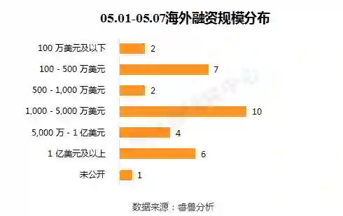 本周海外融资事件的融资规模主要集中在1,000-5,000万美元,共10起。