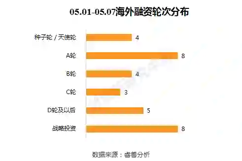 本周海外融资事件的融资轮次分布,前期(种子轮、天使轮、A轮)有12起;中后期(B轮、C轮、D轮及以后)有12起;战略投资有8起。